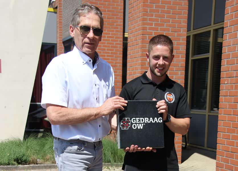 Dendron Gedraag Ow tegel Overhandiging van de Gedraag Ow-tegel aan het Dendron College