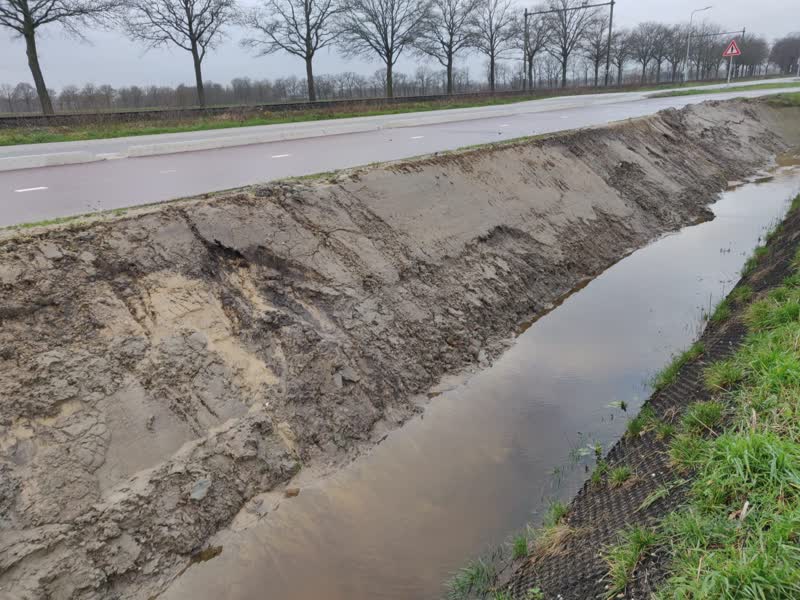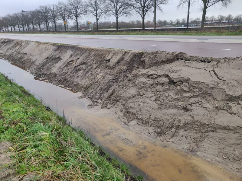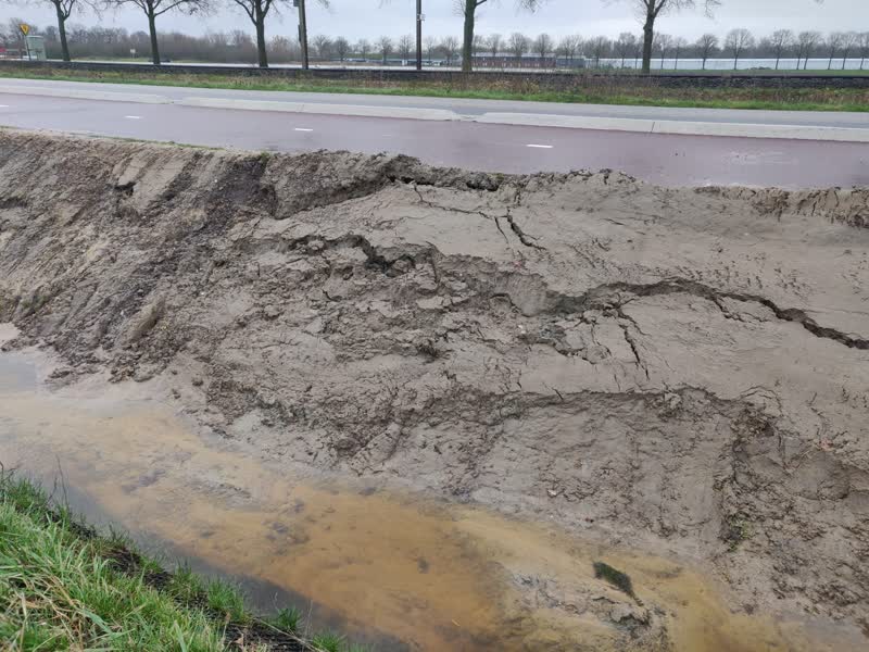 De onlangs aangelegde Greenport Bikeway heeft het zwaar te verduren. Door de hevige regenval van de afgelopen weken, brokkelt het fietspad af. De zijwand kan de regenval niet aan.