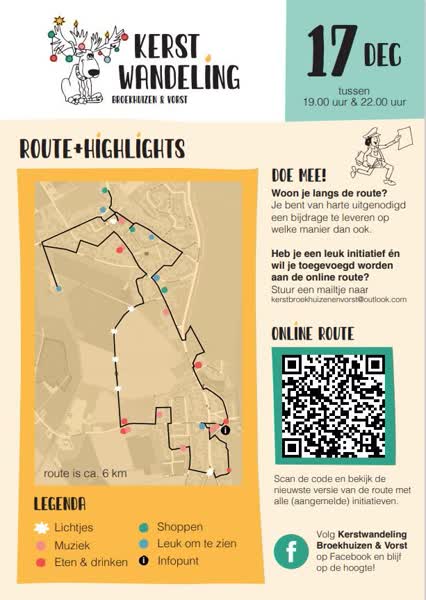 Deze wandeling is ongeveer 6 km lang en loopt door beide dorpen. Langs de route vinden diverse activiteiten plaats:De fanfare van Broekhuizen speelt op het kerkpleinDe horeca van Broekhuizen zorgt voor een hapje en drankje in KerstsfeerBij Aan de Molenberg wordt muziek gemaaktNard Reinders speelt bij Lignum AntiquumBij het kapelletje wordt het Kerstverhaal voorgelezenDe binnentuin van b&b de Zwaluwstaart is te bezichtigen, in Kerstsfeer uiteraardBij Oud en Tiek kan in Kerstsfeer gewinkeld wordenDe kerken in beide dorpen zijn open, de Kerststal is opgezet en er wordt orgelmuziek ten gehore gebrachtOp het kerkplein in Vors worden lichtornamenten geplaatstBij hoeve de Kolck wordt het Kerstverhaal verteld in een toneelspel met kinderenDe fanfare van Broekhuizenvorst speelt bij cafe-zaal ’t DorpDe Roathweg wordt door vuurkorven verlicht: MC Vors verzorgt ditOp de hoek bij de Genenberg/Roathweg worden wafels gebakken en je kunt gluhwein en chocomel drinkenIn een tuin aan de Ellenberg zingt het zangkoor van Well kerstliederenMarjolein Keunen zal op de oprit van haar huis liedjes zingenDe jeugdvereniging van Broekhuizen gaat op de Weem pizza’s bakken om weg te gevenDe Bloemerie opent haar deurenBij Juffrouw Brocante kan gewinkeld wordenOp diverse plekken langs de route worden wafels en warme chocomel verkochtBij het kapelletje aan de Mr Hermansstraat wordt het Kerstverhaal voorgelezen