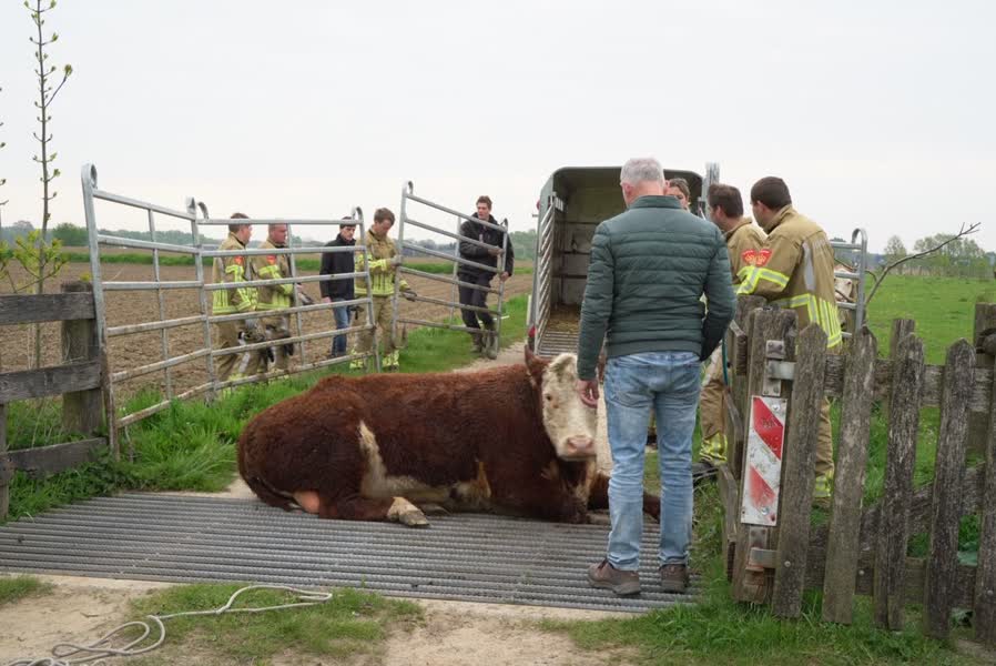 Wandelaars hadden het dier in zijn benarde positie aangetroffen en waarschuwden de boer. Die probeerde in eerste instantie zelf het dier te bevrijden. Dit lukte echter niet en de brandweer werd gewaarschuwd.De brandweer kwam met o.a. een pneumatische spreider ter plaatse. Met behulp van een houten plaat werd het veerooster gedicht zodat het dier op kon staan.De koe hield lichte verwondingen over aan het avontuur, maar kon op eigen kracht de veewagen in die de boer inmiddels had gehaald.