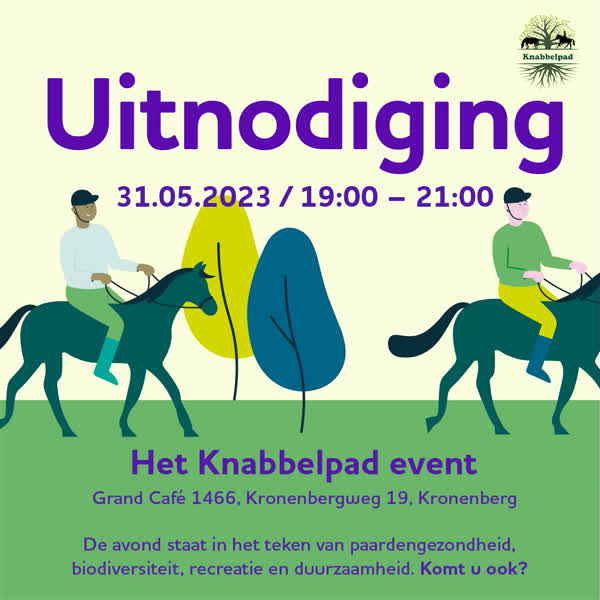 Biodiversiteit verhogenHet doel van het Knabbelpad is om de biodiversiteit in de regio Noord-Limburg te verhogen. Dat gebeurt met een netwerk van paden en weides. Ook draagt het pad bij aan het welzijn van paarden, dat een steeds belangrijker onderwerp in de hippische sector wordt.InspiratieAan het Knabbelpad worden planten en kruiden toegevoegd die de biodiversiteit verhogen en gezond zijn voor paarden. Op die manier kan het medicijnverbruik bij paarden verminderd worden. Het pad dient als voorbeeld en inspiratie voor zoveel mogelijk andere ondernemers.Informatieborden en zitgelegenhedenDe studentengroepen gaan samen met verschillende partners, en de gemeente Horst aan de Maas, aan de slag met het optimaliseren van de bodem om zoveel mogelijk kruiden en planten te plaatsen. Daarnaast worden er informatieborden geplaatst en verschillende zitgelegenheden gecreëerd om het tot een extra leuk ruiter- en wandelpad te maken.KenniseventOp woensdag 31 mei wordt er van 19.00 tot 21.00 uur een kennisevent georganiseerd bij Grand Café 1466 in Kronenberg. De avond staat in het teken van paardengezondheid, biodiversiteit, recreatie en duurzaamheid. Meer informatie en het aanmeldformulier zijn te vinden op de website van Fieldlabs Noord-Limburg.