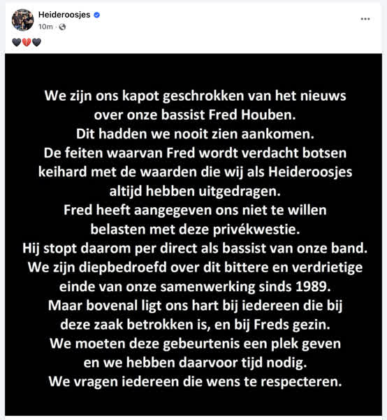 Heideroosjes heeft inmiddels gereageerd op sociale media. Zij geven aan enorm geschrokken te zijn. Fred zou bij hen hebben aangegeven de band niet te willen belasten met zijn privé kwestie. Hij stopt daarom direct als bassist van de band.