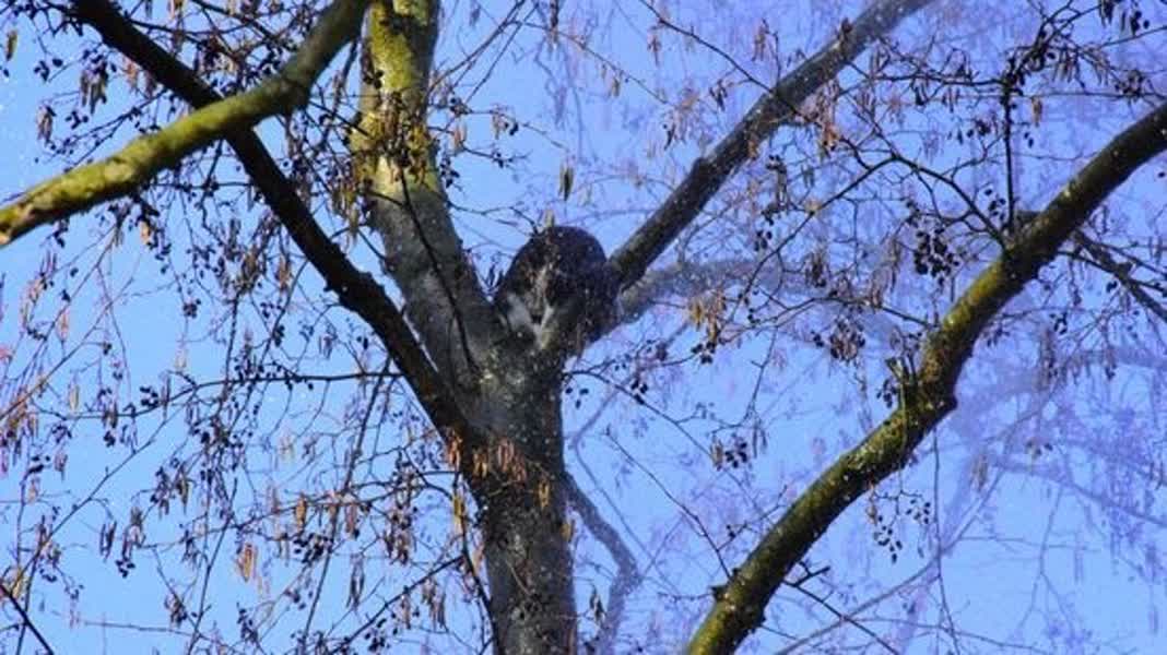 In de Van Lyndenstraat in Blitterswijck zat op zo'n zes meter hoogte een kat in een boom. Het onfortuinlijke beestje zat al meer dan 24 uur op dezelfde plek.