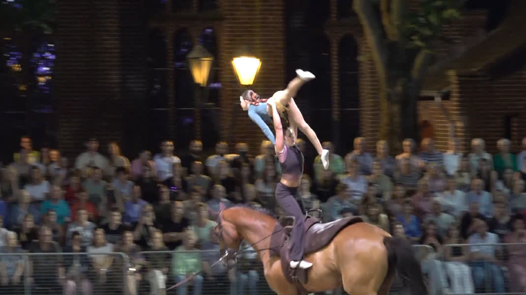 Tijdens het spelen van de muziekstukken verschenen er paarden in de piste. Daarbij ging het om dressuur op hoog niveau en om voltige, dat het beste omschreven kan worden als acrobatiek op een paard.