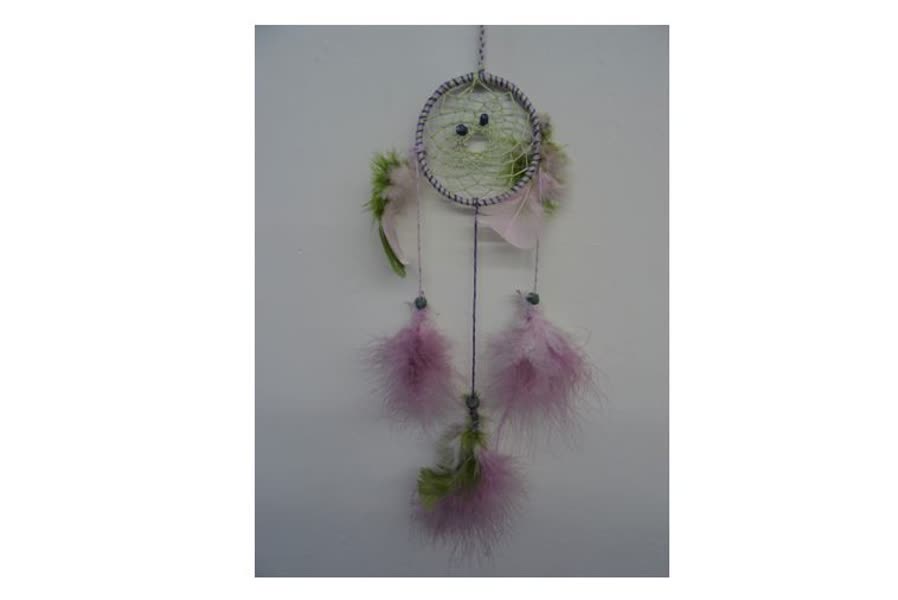 Met garen in leuke kleurtjes, kralen, veertjes enz. wordt de dromenvanger verder versierd. Zo ontstaat een mooi object om in de slaapkamer op te hangen.