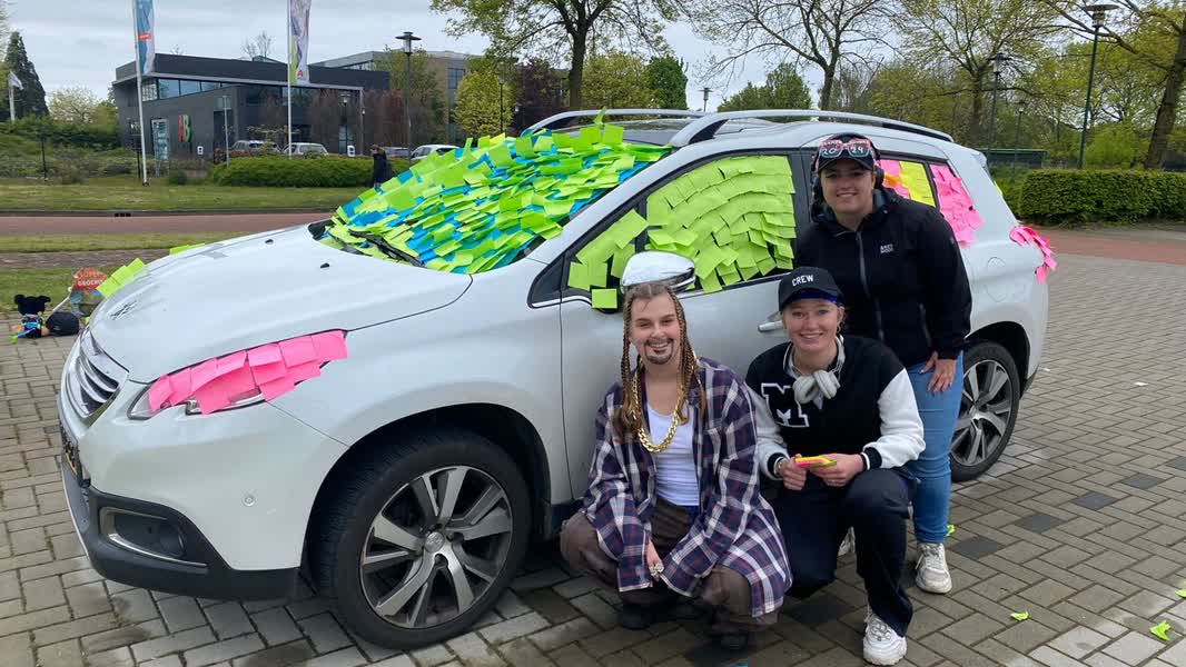 Drie leerlingen van het Yuverta College in Hegelsom hebben een examenstunt georganiseerd voor hun docent Roy Keijsers. Ze plakten zijn hele auto onder met memo’s.