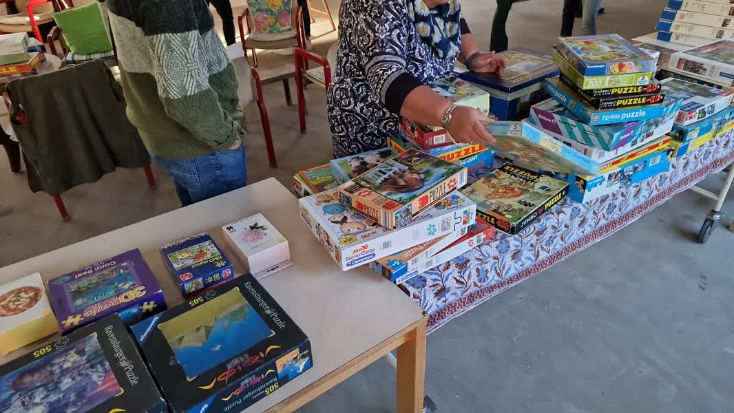 Bezoekers van de ruilbeurs hadden een uurtje de tijd om legpuzzels te ruilen. Daarna begon de verkoop van de gedoneerde puzzels. Over de bestemming hoefden Ria en Marion niet lang na te denken: de opbrengst komt ten goede aan Harmonie Unie in Sevenum. Ria speelt er zelf klarinet en ook het gele gezin van Marion maakt er muziek, behalve Marion zelf.