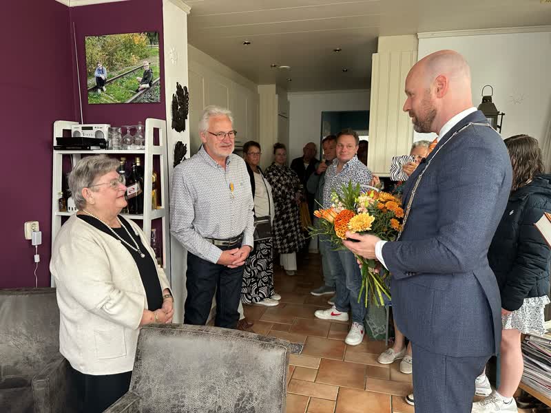 De heer van Hoof kreeg in het bijzijn van familie, vrienden en bekenden de onderscheiding opgespeld door burgemeester Palmen.