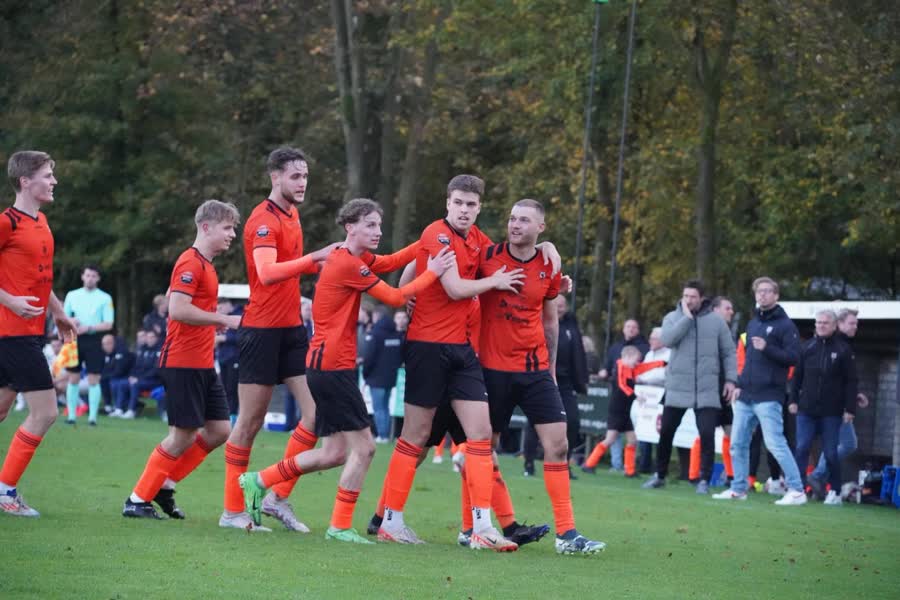 Nog voor rust kwamen de oranjehemden zelfs op 3-0 door een fraaie treffer van middenvelder Meeuwissen: een prachtig uitgevoerde aanval werd voortreffelijk afgerond. Kleine domper op de feestvreugde was dat de bezoekers pal voor rust de aansluitingstreffer maakten: uit een corner viel de bal bij de tweede paal hoog binnen.