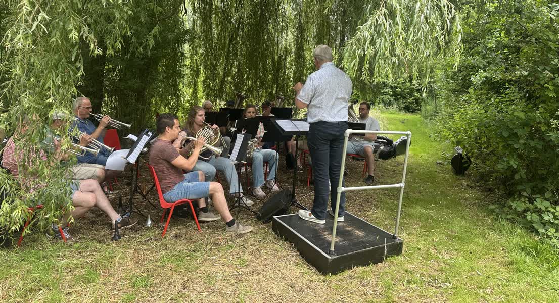 Een van de locaties was het Voedselbos, waar bezoekers onder het groene bladerdak verrast werden door optredens van de muziekvereniging zelf.