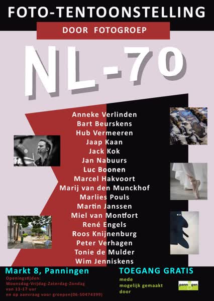 NL-70 is een gezelschap fotografen uit heel Noord-Limburg waaronder ook een zestal uit Horst aan de Maas. Het zijn allemaal fotografen die al wat langer met het foto-bijltje hakken en daar een eigen weg (lees: een eigen stijl) in gevonden hebben.