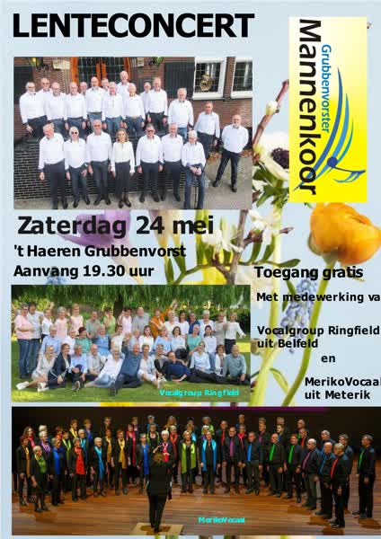 Het Grubbenvorster Mannenkoor onder leiding van Oksana Bos-Baljva geeft op zaterdag 24 mei een Lenteconcert. Het concert vindt plaats in 't Haeren te Grubbenvorst.