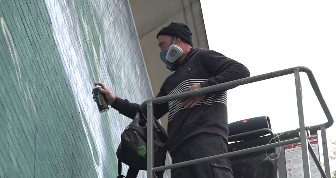 Kijken: kunstenaar Niek Hermkens aan het werk bij grote muurschildering ‘De Pieël in Brand’