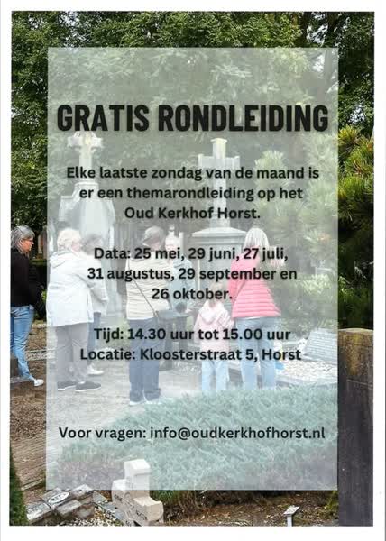 Na het succes van vorig jaar zijn de themarondleidingen op het Oud Kerkhof Horst weer terug. Vanaf mei kunnen bezoekers elke laatste zondag van de maand meewandelen met één van de rondleiders en meer ontdekken over de geschiedenis van deze bijzondere begraafplaats.