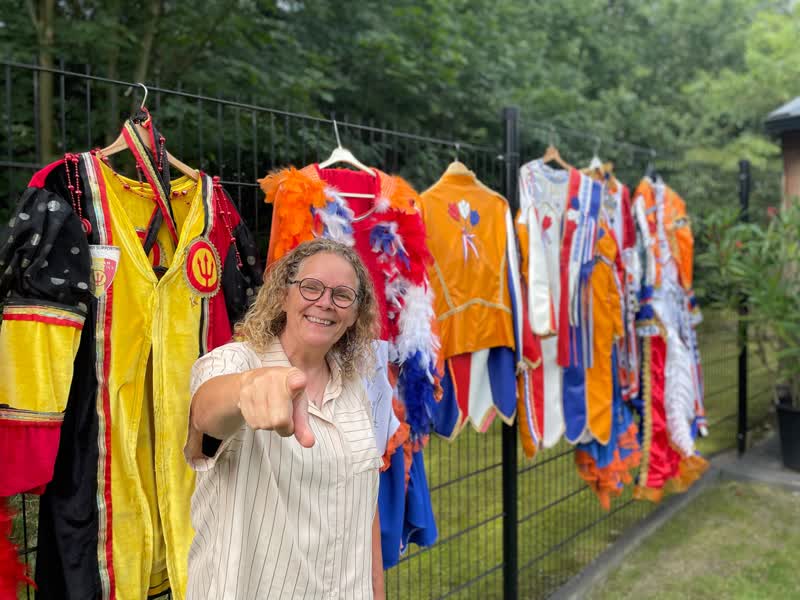 De soms bijna 2 kilogram wegende kaas op het hoofd van Van Rens is het meest kenmerkende, maar ook de pakken die ze draagt zijn een belangrijk onderdeel. Dorpsgenoot Diny van Heijster maakt de pakken speciaal voor Van Rens. Dat zijn er inmiddels vijf in het oranje, maar ook twee speciaal voor België.