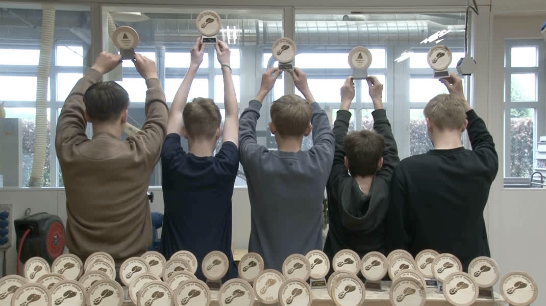 De trofeeën zijn gemaakt door leerlingen van de richtingen Bouwen, Wonen en Interieur (BWI) en Produceren, Installeren en Energie (PIE). Een van de leerlingen vertelt enthousiast over het proces: “Ik vond het heel leuk om dit samen te maken. We werkten als klas aan de trofeeën, ieder met een eigen taak. De één werkte met hout, de ander moest vijlen of metaal buigen. Zo hebben we het echt samen gedaan. Het was niet moeilijk, omdat iedereen zijn eigen stukje deed. We hebben er twee lesuren aan gewerkt en daarna is het verder afgemaakt door de docent.”