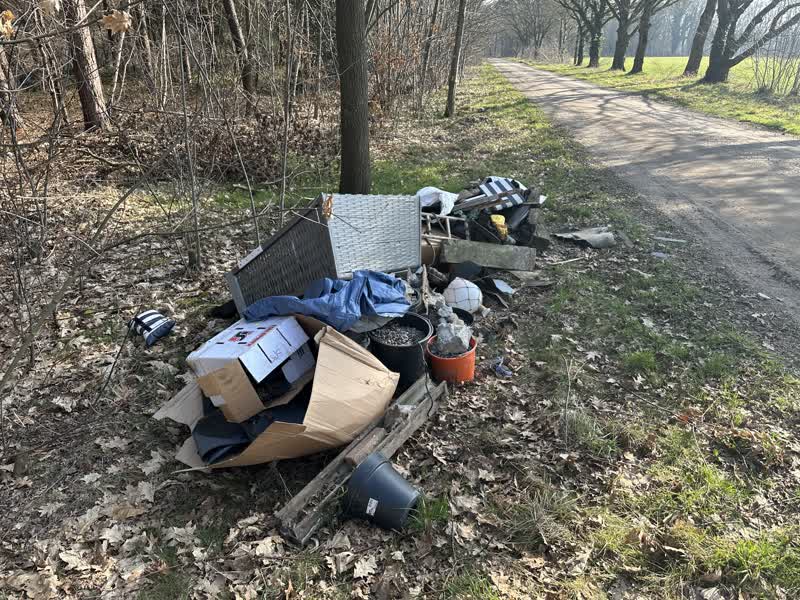 Het gaat volgens een correspondent om een aanzienlijke hoeveelheid afval. Langs de weg liggen onderdelen van een tuin, betonnen opsluitbanden, houten bielzen, dakleer, een tuinbank, een vaas en emmers met grind.
