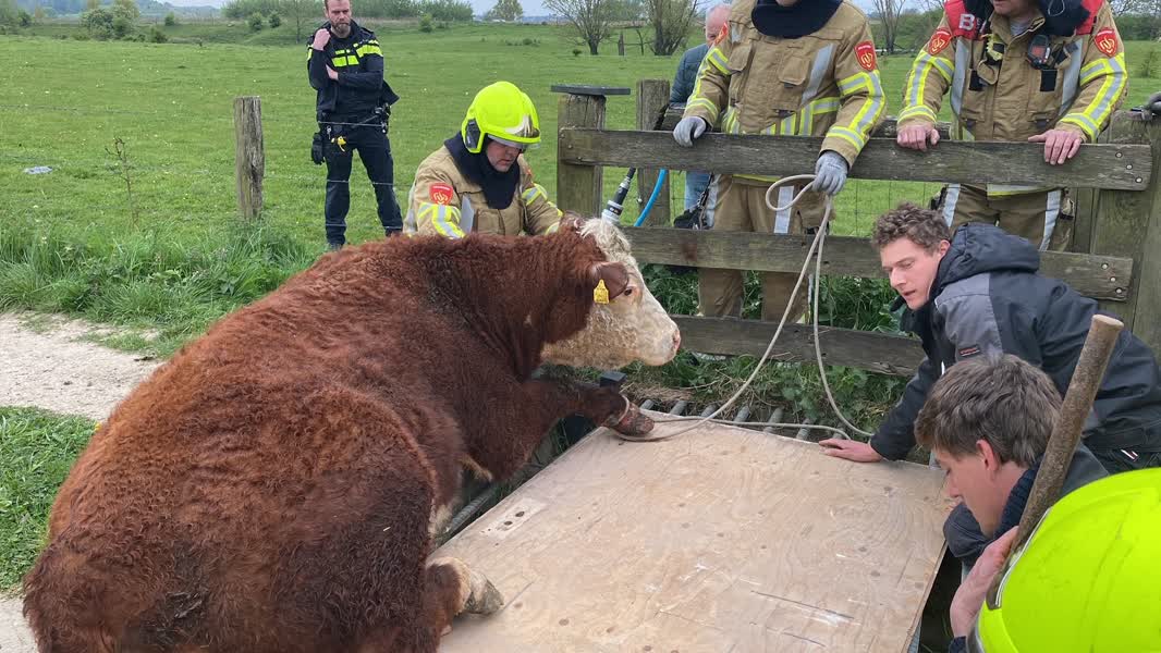 Wandelaars hadden het dier in zijn benarde positie aangetroffen en waarschuwden de boer. Die probeerde in eerste instantie zelf het dier te bevrijden. Dit lukte echter niet en de brandweer werd gewaarschuwd.De brandweer kwam met o.a. een pneumatische spreider ter plaatse. Met behulp van een houten plaat werd het veerooster gedicht zodat het dier op kon staan.De koe hield lichte verwondingen over aan het avontuur, maar kon op eigen kracht de veewagen in die de boer inmiddels had gehaald.