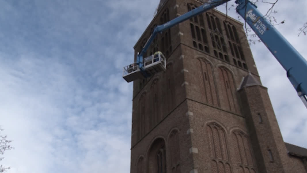 De toren van de kerk is zo'n 35 meter hoog. De klus duurde ongeveer een uur.Ook de computer die de achttien klokken aanstuurt, was hoognodig aan vervanging toe. In de nieuwe computer kunnen maar liefst 100.000 melodieën worden geprogrammeerd.