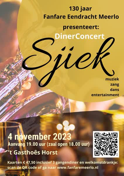 In 2020 bestond de fanfare 130 jaar, dat zou toen al gevierd worden met een DinerConcert.Helaas gooide corona toen roet in het eten. Intussen zijn we drie jaar verder en wordt dit jubileum alsnog gevierd: een DinerConcert met de naam ‘Sjiek’.Het DinerConcert vindt plaats in ‘t Gasthoês in Horst op zaterdag 4 november (aanvang 19:00 uur, zaal open 18:00 uur). Bij grote belangstelling is er een optie op een tweede show op zondag 5 november.De gasten worden ontvangen met een welkomstdrankje en nemen plaats in het theater- restaurant. Gedurende het eerste deel van het concert worden twee gangen van het diner geserveerd. In de pauze is er een ‘dessert-buffet’ en wordt het ‘restaurant’ omgebouwd tot feestzaal. Tijdens het tweede deel van het concert kunnen de voetjes van de vloer en kan er volop gefeest worden.AfwisselingHet muzikale programma is zeer afwisselend: van Abba, een Proms Medley en Coldplay tot The Prayer, Kippenvel en November en nog veel meer.Naast uiteraard Fanfare Eendracht o.l.v. dirigent Miko Derks is er een combo, dansgroep Terza Dance, Close Harmony Group Confetti en (solo)zang van: Auke Classens, Niels Fransen, Daniëlle van den Homberg - De Kleijn en Guus Vreugdewater.