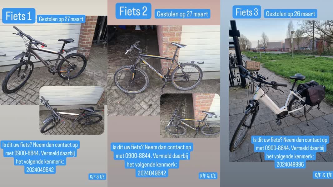 De politie is momenteel op zoek naar de eigenaren van de fietsen. Bekijk de foto's hieronder. De eigenaren kunnen zich melden via 0900-8844. De politie doet verder onderzoek naar de diefstallen.