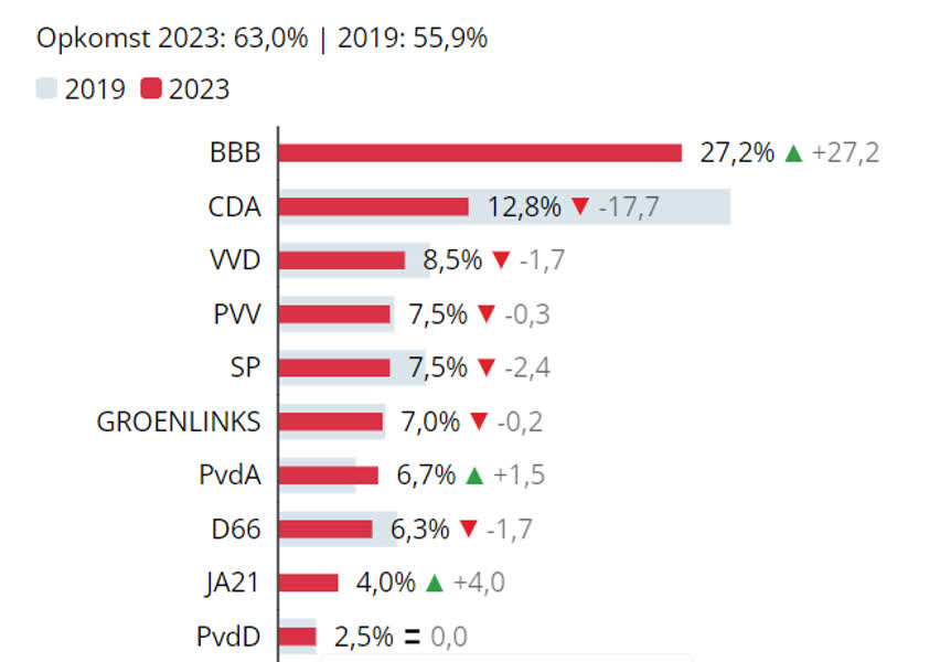 Dat is tenminste de voorlopige uitslag nadat ruim 90 procent van de stemmen is geteld.Door deze uitslag staat vast dat het Limburgse platteland het vertrouwen in het CDA resoluut heeft opgezegd.Kiezer straft CDA afWas het CDA vier jaar geleden nog onmiskenbaar de grootste partij in onze provincie, nu is het CDA een van de grote groep middelgrote partijen in de Statenzaal.Dat zal voor een groot deel komen door het landelijk (stikstof-)beleid, maar ook in het Gouvernement heeft het CDA zichzelf geen dienst bewezen door de affaire-Vrehen.ProteststemDe BBB lijkt ook een belangrijk deel van de Limburgse proteststem te hebben gekregen.Vier jaar geleden kreeg Forum voor Democratie nog de steun van veel kiezers die hun vertrouwen in de gevestigde orde hadden verloren. Die kiezers hebben inmiddels ook hun rug gekeerd naar de partij van Baudet. Een deel hiervan vestigt nu hun hoop op JA21, maar toch lijkt BBB ook te profiteren van de ineenstorting van Forum voor Democratie.PVVIn een prognose leek eerder de PVV nog de grootste partij van Limburg te worden.Dat is niet gelukt, de beweging van Wilders blijft steken op een tweede plek en is ongeveer even groot als in 2019. De PVV heeft dus niet geprofiteerd van de ineenstorting van FvD.Toch deed de partij het goed in de grote steden als Heerlen, Venlo en Sittard-Geleen.CoalitieMet deze uitslag lijkt een coalitie over rechts de meest logische keuze.Een college van Gedeputeerde Staten zou kunnen worden gevormd met BBB, PVV, VVD én CDA. Want ook al heeft de Limburgse kiezer zich duidelijk uitgesproken, de kans is aanzienlijk dat het CDA na deze oorwassing opnieuw in het provinciebestuur terechtkomt.ExtraparlementairAan de andere kant heeft Limburg de afgelopen jaren ook uitgebreide ervaring opgedaan met een extraparlementair college. Vier jaar geleden werd daarvoor gekozen, en ook toen dat college door de affaire-Vrehen opstapte kwam er een provinciebestuur dat niet leunde op een doortimmerd coalitieplan. De komende maanden zal duidelijk worden, hoe het Limburgs provinciebestuur vorm zal krijgen.Horst aan de MaasIn de gemeente Horst aan de Maas won BBB ook ruim. De partij behaalde 27,2% van de stemmen. Daarop volgde het CDA (12,8%), VVD (8,5%), PVV (7,5%) en SP (7,5%).