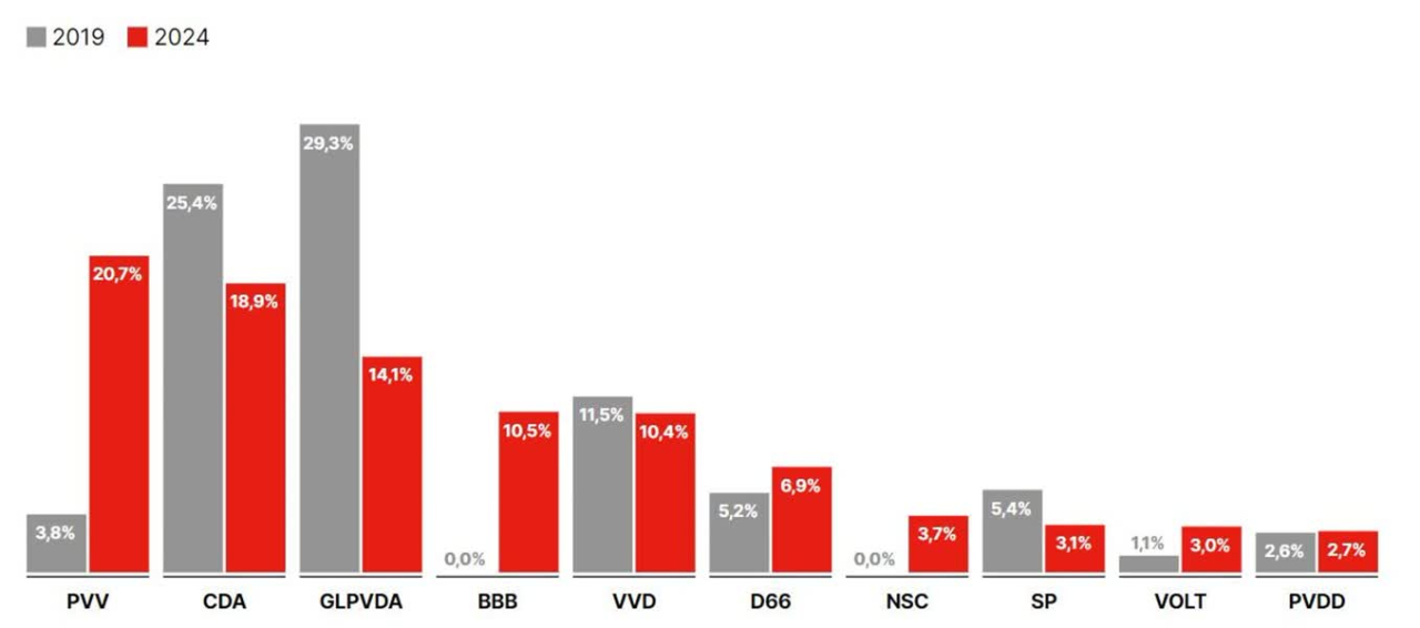 Tijdens de vorige Europese verkiezingen in 2019 kreeg de PVV 3,8 procent van de stemmen. Een winst dus van bijna 19 procent. PvdA/GroenLinks was vijf jaar geleden de grootste partij met 29,3 procent, maar levert nu de helft daarvan in. Het CDA had in 2019 25,4 procent en is daarvan nu een kwart kwijt.