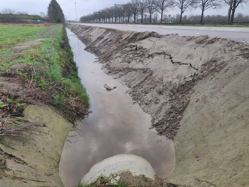 De onlangs aangelegde Greenport Bikeway heeft het zwaar te verduren. Door de hevige regenval van de afgelopen weken, brokkelt het fietspad af. De zijwand kan de regenval niet aan.