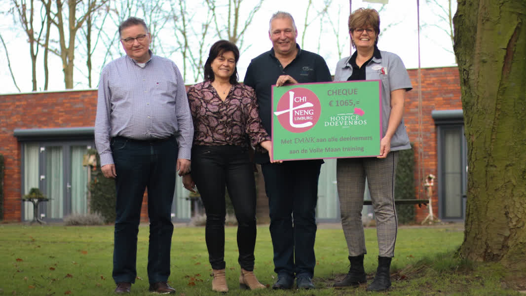 De cheque werd vrijdag overhandigd aan Jan Nabben, voorzitter van Vrienden Hospice Doevenbos en aan Thea van den Bekerom, verpleegkundige van het hospice.Chi Neng Limburg geeft maandelijks een volle maan training op het gebied van Chi Neng Qigong, een Chinese bewegingsleer. Deelnemers betaalden elke keer een vrijwillige bijdrage, die bestemd was voor het hospice.